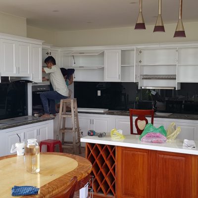 Hoàn Thiện Nội Thất Tủ Bếp Gỗ Căm Xe Sơn Màu Trắng Nhà Anh Long Thủ Đức