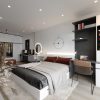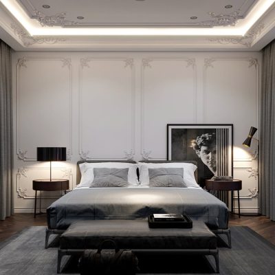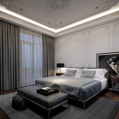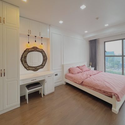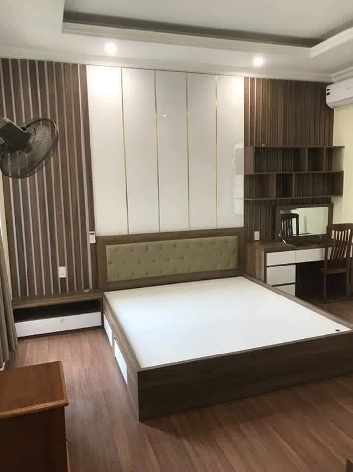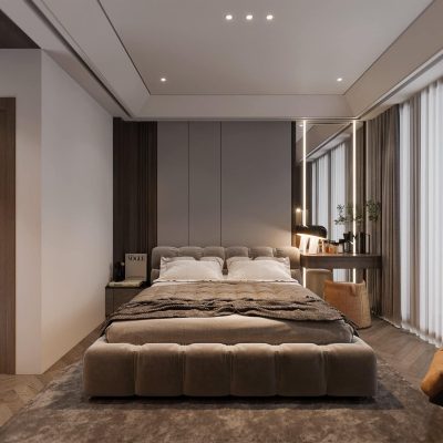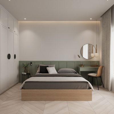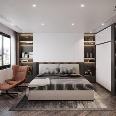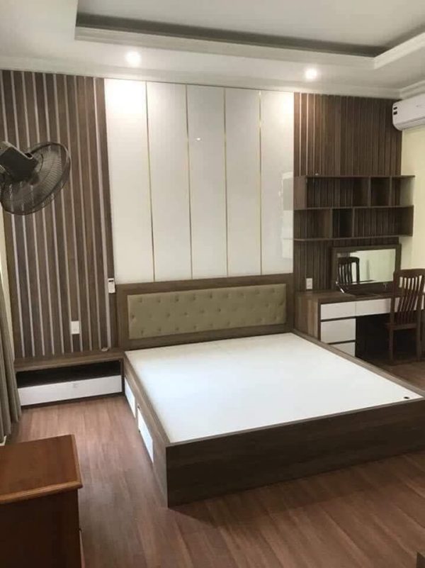 Mẫu thiết ké nội thất phòng ngủ bao gồm giường ngủ có học kéo, bộc nệm đầu giường, vách đầu giường, tap đầu giường, tủ áo, bàn trang điểm, kệ tivi, với các vật liệu ván công nghiệp mdf chống amar phủ melamine, tấm than tre vân đá …