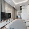 Mẫu thiết ké nội thất phòng ngủ bao gồm giường ngủ có học kéo, bộc nệm đầu giường, vách đầu giường, tap đầu giường, tủ áo, bàn trang điểm, kệ tivi, với các vật liệu ván công nghiệp mdf chống amar phủ melamine, tấm than tre vân đá …