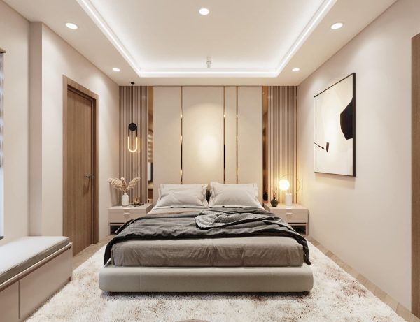 Mẫu thiết ké nội thất phòng ngủ bao gồm giường ngủ có học kéo, bộc nệm đầu giường, vách đầu giường, tap đầu giường, tủ áo, bàn trang điểm, kệ tivi, với các vật liệu ván công nghiệp mdf chống amar phủ melamine, tấm than tre vân đá …
