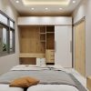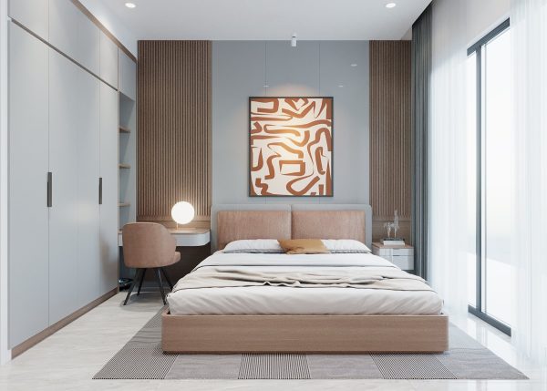 Mẫu thiết ké nội thất phòng ngủ bao gồm giường ngủ có học kéo, bộc nệm đầu giường, vách đầu giường, tap đầu giường, tủ áo, bàn trang điểm, kệ tivi, với các vật liệu ván công nghiệp mdf chống amar phủ melamine, tấm than tre vân đá …