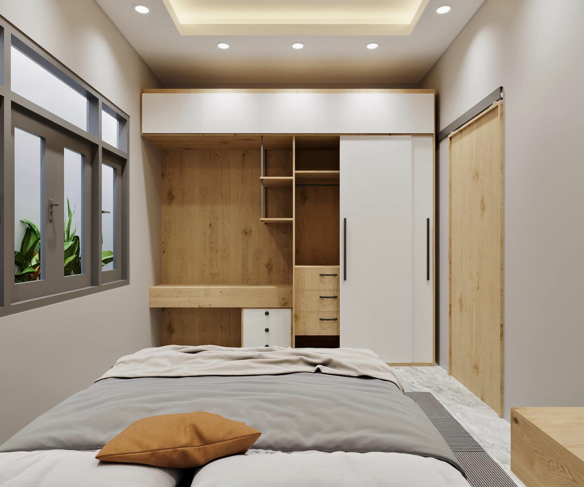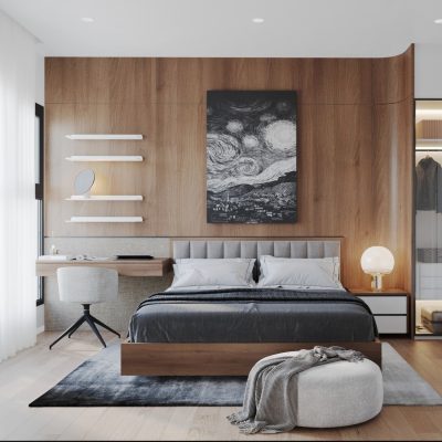 Mẫu thiết ké nội thất phòng ngủ bao gồm giường ngủ có học kéo, bộc nệm đầu giường, vách đầu giường, tap đầu giường, tủ áo, bàn trang điểm, kệ tivi, với các vật liệu ván công nghiệp mdf chống amar phủ melamine, tấm than tre vân đá …