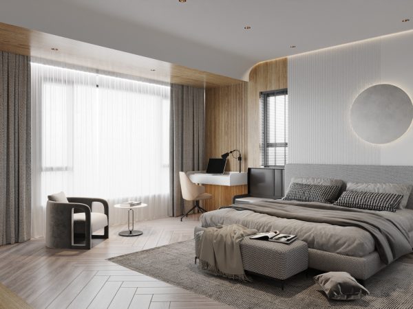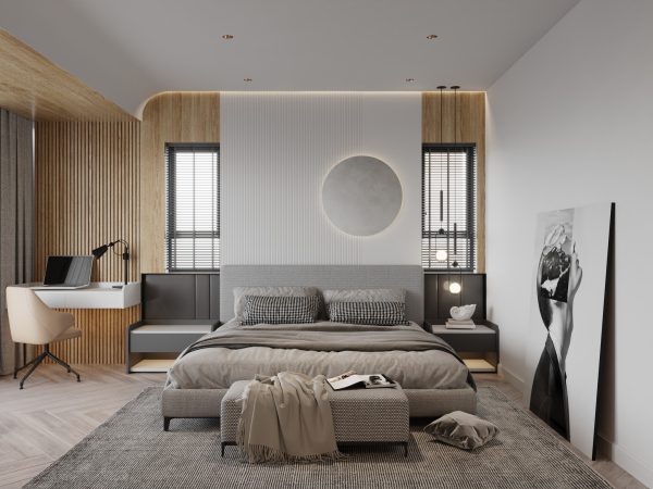 Mẫu thiết ké nội thất phòng ngủ bao gồm giường ngủ có học kéo, bộc nệm đầu giường, vách đầu giường, tap đầu giường, tủ áo, bàn trang điểm, kệ tivi, với các vật liệu ván công nghiệp mdf chống amar phủ melamine, tấm than tre vân đá …