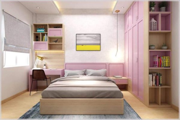 Mẫu thiết ké nội thất phòng ngủ bao gồm giường ngủ có học kéo, bộc nệm đầu giường, vách đầu giường, tap đầu giường, tủ áo, bàn trang điểm, kệ tivi, với các vật liệu ván công nghiệp mdf chống amar phủ melamine, tấm than tre vân đá …