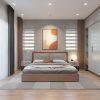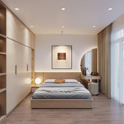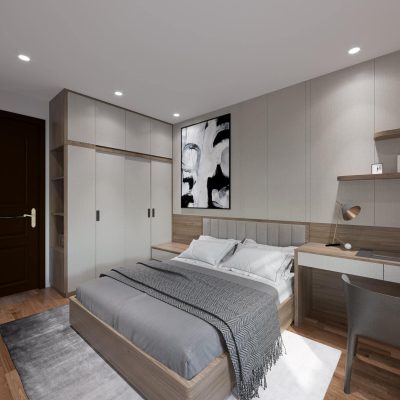 Mẫu thiết ké nội thất phòng ngủ bao gồm giường ngủ có học kéo, bộc nệm đầu giường, vách đầu giường, tap đầu giường, tủ áo, bàn trang điểm, kệ tivi, với các vật liệu ván công nghiệp mdf chống amar phủ melamine, tấm than tre vân đá …