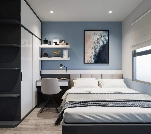 Mẫu thiết ké nội thất phòng ngủ bao gồm giường ngủ có học kéo, bộc nệm đầu giường, vách đầu giường, tap đầu giường, tủ áo, bàn trang điểm, kệ tivi, với các vật liệu ván công nghiệp mdf chống amar phủ melamine, tấm than tre vân đá …