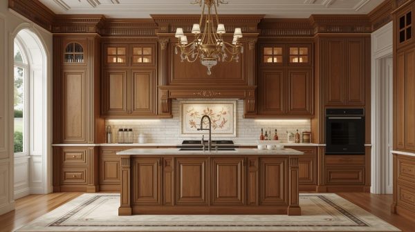 Tủ bếp gỗ tự nhiên theo phong cách cổ điển thường có thiết kế cầu kỳ, với các chi tiết chạm khắc tinh xảo và màu sắc ấm áp. Loại tủ này mang lại vẻ đẹp sang trọng và truyền thống.