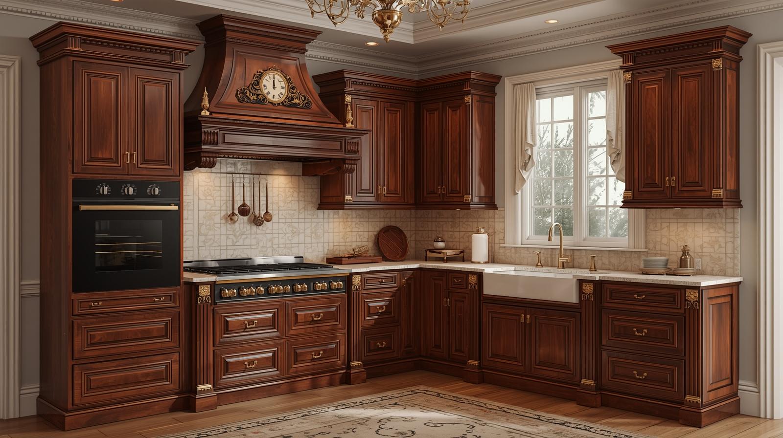 Tủ bếp gỗ tự nhiên theo phong cách cổ điển thường có thiết kế cầu kỳ, với các chi tiết chạm khắc tinh xảo và màu sắc ấm áp. Loại tủ này mang lại vẻ đẹp sang trọng và truyền thống.