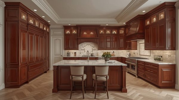 Tủ bếp gỗ tự nhiên theo phong cách cổ điển thường có thiết kế cầu kỳ, với các chi tiết chạm khắc tinh xảo và màu sắc ấm áp. Loại tủ này mang lại vẻ đẹp sang trọng và truyền thống.