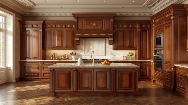 Tủ bếp gỗ tự nhiên theo phong cách cổ điển thường có thiết kế cầu kỳ, với các chi tiết chạm khắc tinh xảo và màu sắc ấm áp. Loại tủ này mang lại vẻ đẹp sang trọng và truyền thống.