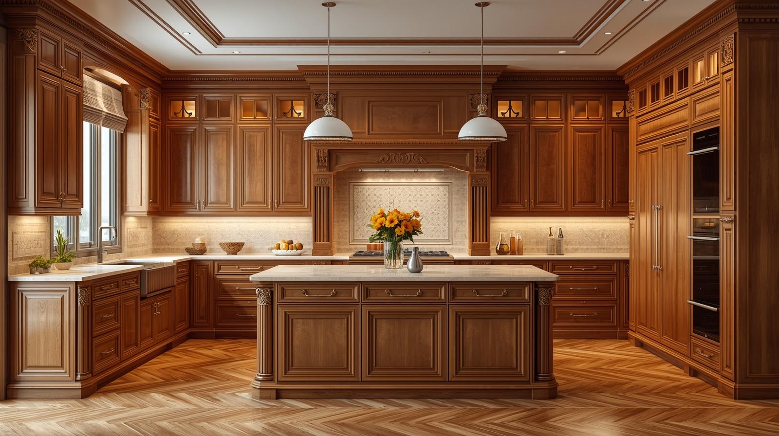 Tủ bếp gỗ tự nhiên theo phong cách cổ điển thường có thiết kế cầu kỳ, với các chi tiết chạm khắc tinh xảo và màu sắc ấm áp. Loại tủ này mang lại vẻ đẹp sang trọng và truyền thống.