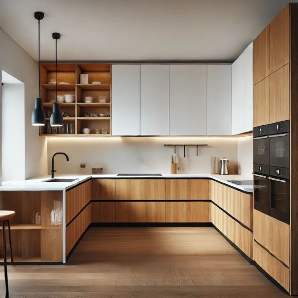 – Tủ bếp được làm từ gỗ công nghiệp cao cấp HDF chống ẩm và phủ melamine chống trầy, cho độ bền và độ sáng bóng theo thời gian.